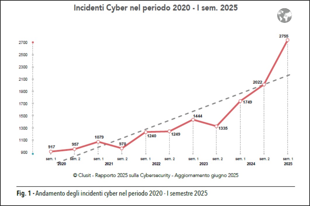 Nei primi 6 mesi del 2025, gli attacchi avvenuti con successo contro le Organizzazioni del nostro Paese costituiscono il 10% del totale degli eventi rilevanti a livello mondiale.